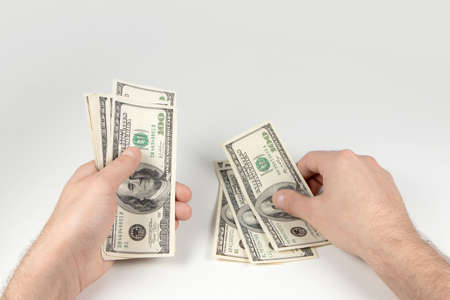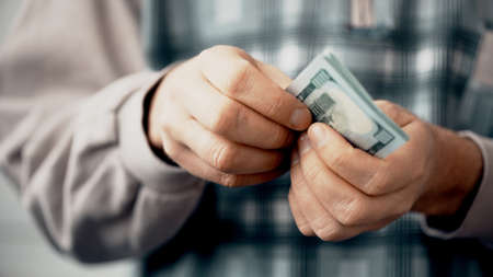 hand recount dollars. the man counts the money. new hundred-dollar bills