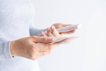 Asian woman hand counting money on white background. Money baht of thailand in her hand.