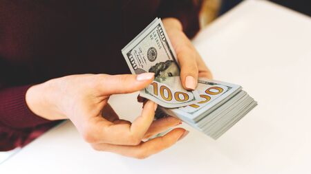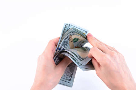 Woman's hands, count money, American one hundred dollar bills. Isolated on white. Copy space.