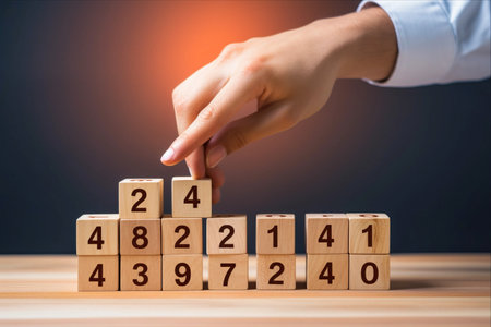 Ascending order numbers, black typeface on white cube with reflection on wood table surface. Finance, strategy economy, education concept, set of permute number on white background with copy space.