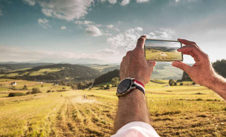 Tourist man taking photo of beautiful hills landscape with smartphone - hand touching screen. Traveling and mobile phone outdoor photography.