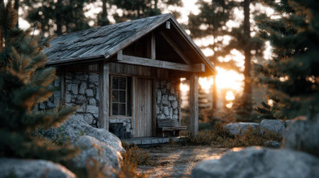 Picturesque wooden cottage nestled among forest trees, offering a peaceful and scenic setting for a perfect nature getaway.