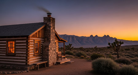 Desert Log Cabin with Smoking Chimney at Golden Sunset