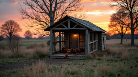 Rustic chicken coop at sunset with hens roaming in peaceful countryside farm. That the image is generated using AI.
