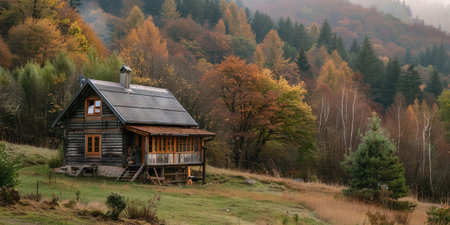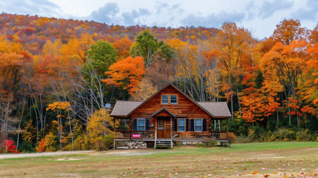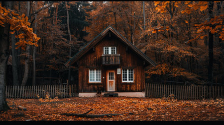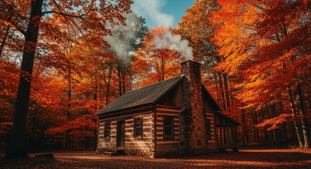 Charming wooden cabin nestled in serene forest, surrounded by vibrant autumn foliage. warm colors of leaves create cozy atmosphere, inviting tranquility and reflection