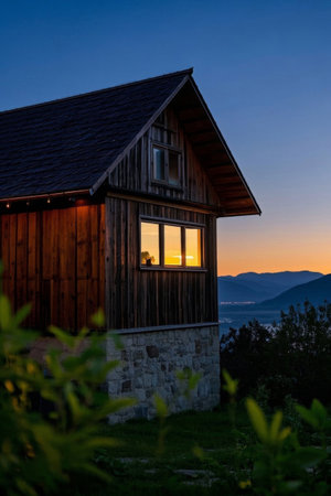 Dusk view of the mountain cabin