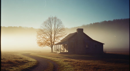Abandoned farmhouse on a misty morning in the countryside