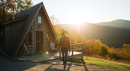 A young woman in a cozy sweater and hat leaning on a wooden railing of a cabin, surrounded by autumn foliage and mountains in the background