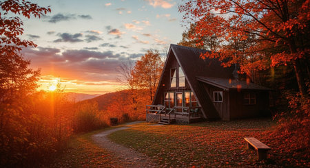Lakeside cabin surrounded by vibrant autumn foliage reflecting on calm waters at sunset