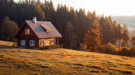 A peaceful wooden log cabin in serene autumn forest at sunrise. rustic mountain hut with warm sunlight and golden leaf for cozy nature getaway