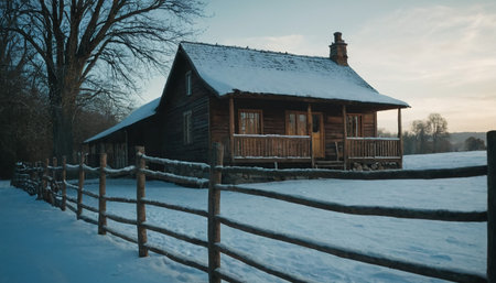 A charming wooden log cabin is covered in snow, with a rustic fence in the foreground, bathed in the soft light of a winter sunset.