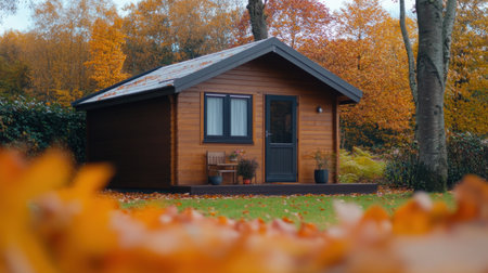 This cozy wooden cabin, surrounded by vibrant autumn leaves, embodies tranquility and peace, showcasing the beauty of nature in a calming woodland setting.