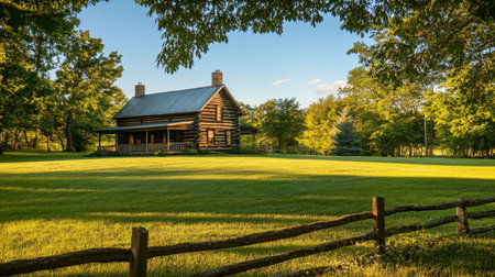 A beautiful log cabin nestled in a scenic landscape, surrounded by vibrant greenery, showcasing rustic charm in the tranquil evening light. Perfect for retreats and outdoor escapes.