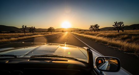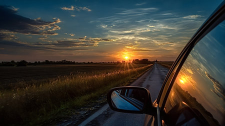Car traveling on a straight rural road, reflecting the vibrant golden sunset in the side mirror and window, creating a serene and expansive feeling of journey and freedom