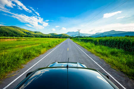 Couple driving car on country road with beautiful nature landscape, rear view. Road trip and weekend activities concept. Summer holidays