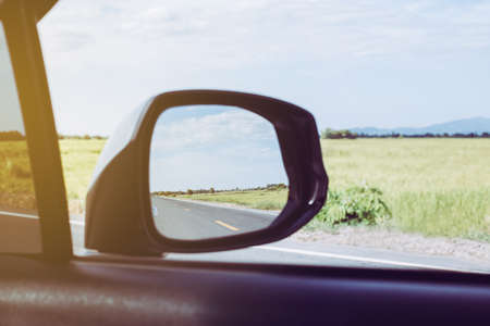 Beautiful view landscape on car mirror from inside a car on road,Travel and vacation concept