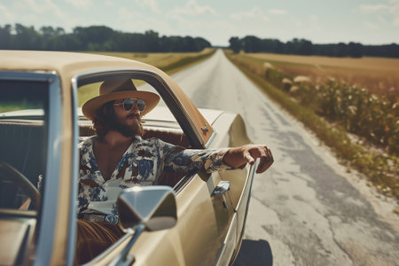 A fashionable and stylish man enjoys a leisurely drive along a scenic country road surrounded by beauty. Generative AI