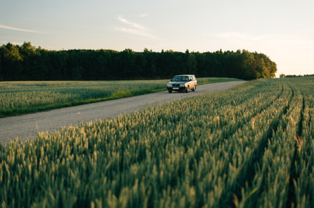 a small car moves along a country road at sunset in this intensely detailed stock photo. captured in 8k resolution and shot on 70mm, the image showcases the beauty of rural america with an american tonalism style. perfect for high-quality projects requiring a stunning visual impact. ai generated