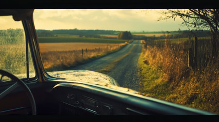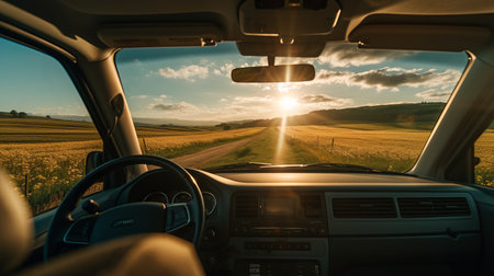 interior view of a luxury sports car, capturing the essence of a romanticized country life. sunrays illuminate the scene, adding a touch of golden light to the nature-inspired imagery. the driver's perspective showcases the beauty of rural life, with brushstroke fields stretching into the distance. this captivating photo was taken with the tokina at-x 11-16mm f/2.8 pro dx ii lens. ai generated