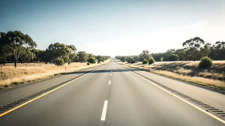 Long straight empty road stretching through a dry Australian landscape. Clear sky and warm sunlight illuminate scenery. Journey and travel concept.