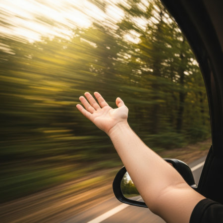 A person's hand is sticking out of a car window as the vehicle drives down a road surrounded by trees, capturing the feeling of freedom and joy on a road trip.