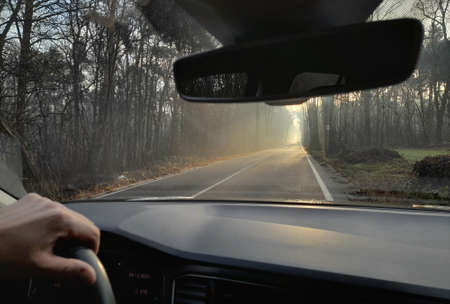 car travel concept hands on steering wheel highway in mist sunrise