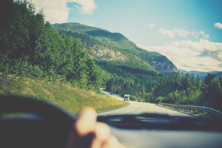 Driving a car on mountain road. Road among mountains. Beautiful nature of Norway.