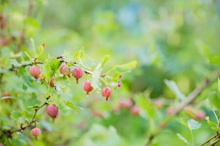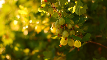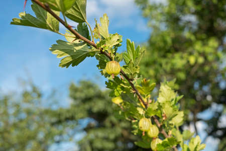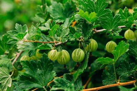 Fresh gooseberry on a branch of a gooseberry Bush in the garden. Close-up view of organic gooseberry berries hanging on a branch under the leaves