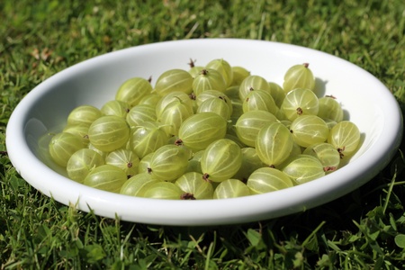 Gooseberry. Ripe gooseberries in a salad bowl on a white wooden table