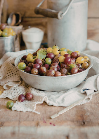 A bowl filled with vibrant gooseberries sits on a rustic wooden table, accompanied by a vintage water jug and cloth napkin.