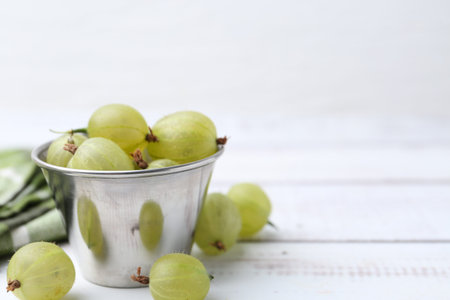 Ripe green gooseberries in bowl on white wooden table, closeup. Space for text