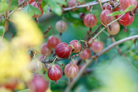 Ripe gooseberries on a bush in the garden. The harvest of gooseberries.