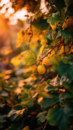 Gooseberry swaying gently in the wind, realistic photography style, bright and vivid colors, natural lighting, detailed textures on the leaves, soft motion blur to suggest wind movement, ultra realistic, high resolution, cinematic atmosphere.