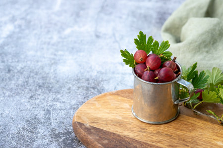 Ripe gooseberry in a wooden plate, place for text, summer harvest of berries.