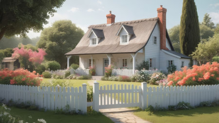Charming countryside home surrounded by a white picket fence, representing rural comfort, tradition, and peaceful domestic life.