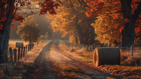 A picturesque autumn scene featuring a rural farm road lined with golden foliage and hay bales. The warm sunlight casts a soft glow over the landscape, creating a tranquil and idyllic countryside view.