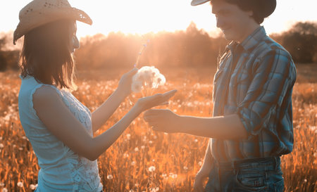 A couple show heart with hands in cotton field. Woman in white dress and man in blue jeans and white T-shirt. Girl and boy holding hands. Couple on valentines day. Clock and decoration on woman's hand
