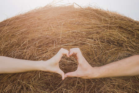 Closeup view of young couple in love making heart shape with male and female hands together on dry hay stack in farmland. Horizontal color photography.