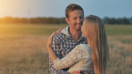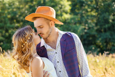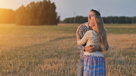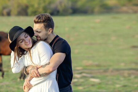 Young couple guy and girl in the field hugging, romantic relationship concept.