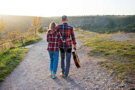 Hiking romance. Beautiful romantic couple happy smiling faces nature background. Boyfriend and girlfriend with guitar. Romantic walk. Romantic song. Love inspires them. Fresh air and pure feelings