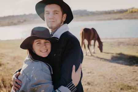 Cute romantic beautiful young couple embracing and laughing near horses in a autumn field pasture. Girl in hat and white dress. Tender moment of love, happy marriage, sincere feelings concept.