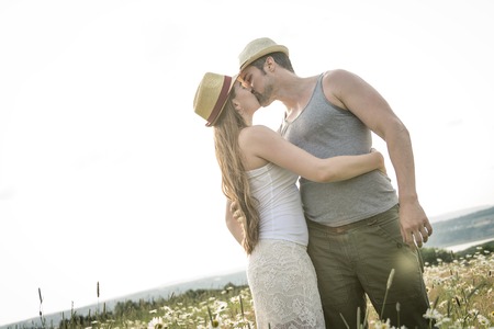 Beautiful couple in love, dating on the beach at sunset, kissing. Fashionable woman and man wearing boho hats. Summer lifestyle. Real people concept.