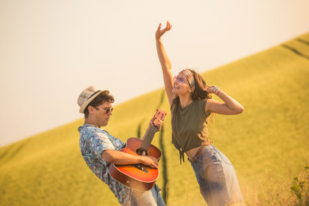 Young couple in love sitting on the park while these young guitar playing guitar in sunset time.