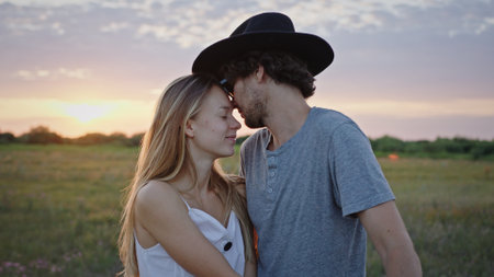 A Romantic Sunset Embrace Shared by a Beautiful Couple in a Picturesque Countryside Setting