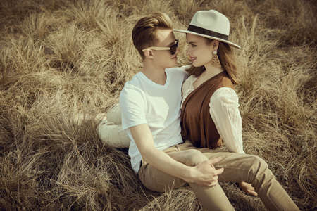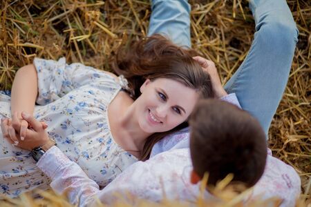 Happy young couple on straw, romantic people concept, beautiful landscape, summer season.