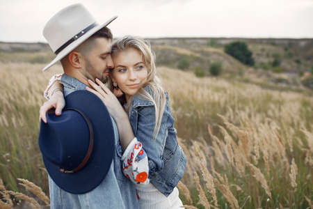 A loving couple is walking around the fields. Warm autumn. Summer. Spring. Happy couple. Wedding.