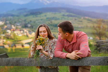 A young woman and man are standing against a beam. Behind them is a beautiful landscape with a view of the mountains. The woman is holding a bouquet and she is inhaling the scent of the flowers.