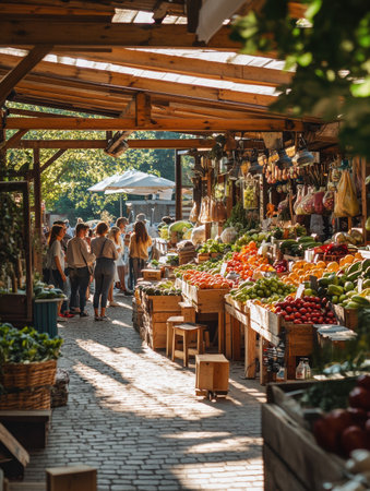 Wooden stalls filled with colorful fresh produce attract lively crowds under warm sunlight in a vibrant open-air market setting.