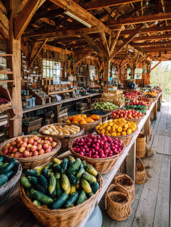 Colorful displays of fruits and vegetables fill baskets on wooden tables at a quaint farmers market in a rural setting, inviting shoppers to explore