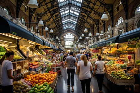 A bustling market showcases an array of colorful fruits, vegetables, and various food items. Shoppers explore the aisles, creating a sense of activity and community. The scene is illuminated by natural and artificial lighting, highlighting the textures and variety of the goods. This image may be suitable for illustrating food retail or culinary topics.